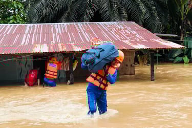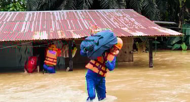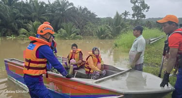 Anggota Pertahanan Awam membantu memindahkan mangsa banjir di kawasan terjejas